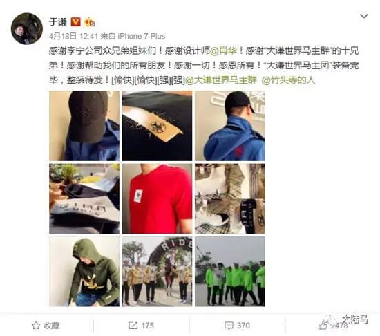 4月18日,著名相声演员、马主于谦在微博表示,经由李宁公司旗下知名设计师肖华设计的大谦世界明星马主团全新装备亮相。