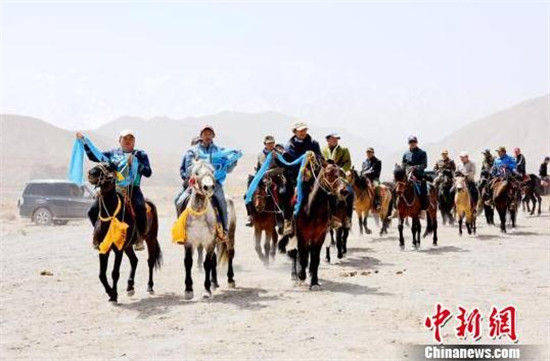 5月10日,甘肃省肃北蒙古族自治县党城湾镇马场村开展敖包祭祀及赛马活动。赛马大赛上,骑手们策马奔腾,驰骋在初夏的戈壁滩上。同时还举办了摔跤、射箭等男儿技艺比赛。当日前来祭拜敖包的蒙古族民众,为敖包添置石块,祈求国泰民安、风调雨顺、家人安康。