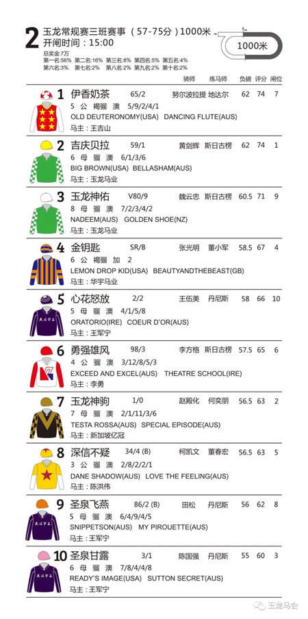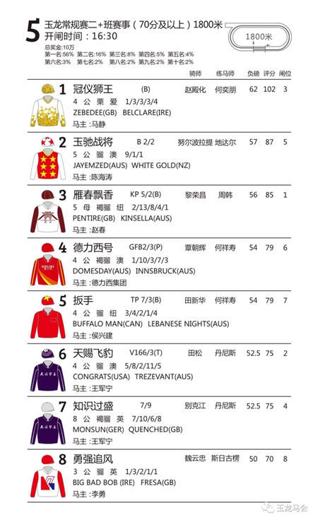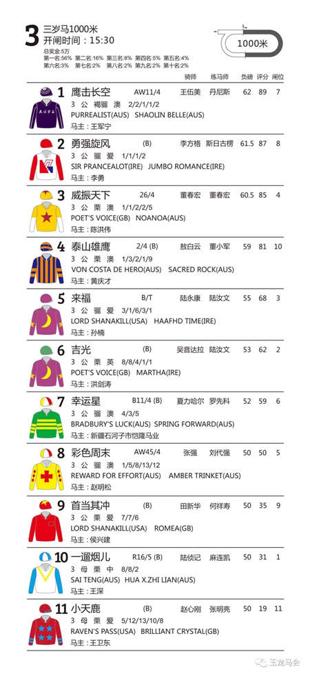 除了第1场以外,第3场、第5场同样值得关注。第3场出战的“鹰击长空”在上一场比赛中遗憾夺银,本场比赛或将是其加冕之战;同样在本场出赛的“勇强旋风”若能夺冠将书写4连冠。而第5场比赛因集中了“冠仪狮王”“玉驰战将”“扳手”等玉龙国际赛马公开赛赛道上的高分优骏成为本赛事日的另一大关注点。