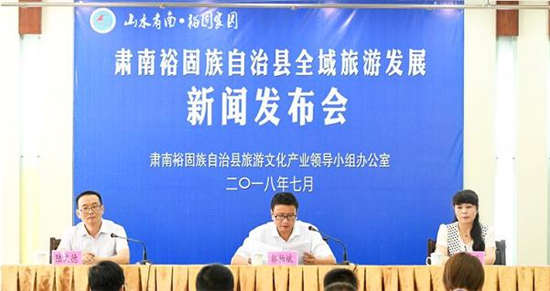 7月22日下午,由每日甘肃网和张掖市委网信办组织的“2018年全国重点网络媒体、网络大V甘肃行”采访团走进甘肃省肃南县,该县旅游局局长郭柏斌,旅游局副局长王春蕊共同发布了肃南县创建全域旅游示范区的基本情况,并就记者们关注的问题一一作出解答。