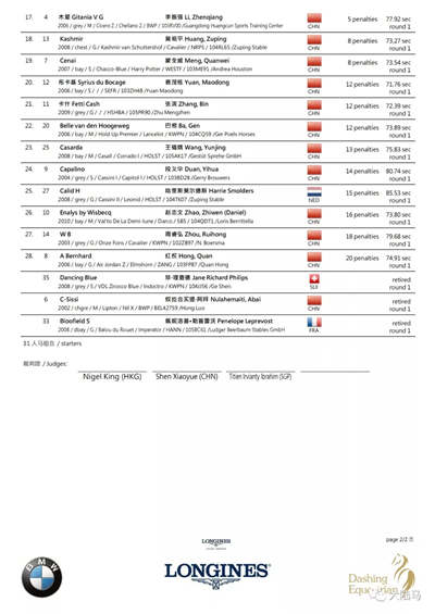 第三天的比赛,分别进行了U14新星赛、宝马精英赛决赛以及浪琴表大奖赛决赛三项赛事。其中小骑手陈可翊携爱驹“Chou Chou Z”以22.07秒零罚分的成绩笑傲群雄,斩获U14新星赛桂冠;宝马精英赛决赛中,第一轮冠军文森特延续了他火热的状态,携爱驹”Ceylon“以40.99秒的成绩拔得头筹;最后压轴的浪琴表大奖赛决赛中,上届冠军亨里克·冯·艾克曼,搭档爱马“Cincitty”以38.38秒的成绩零罚分完赛,成功卫冕!