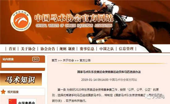 中国马术协会公布2020年东京奥运会运动员选拔标准