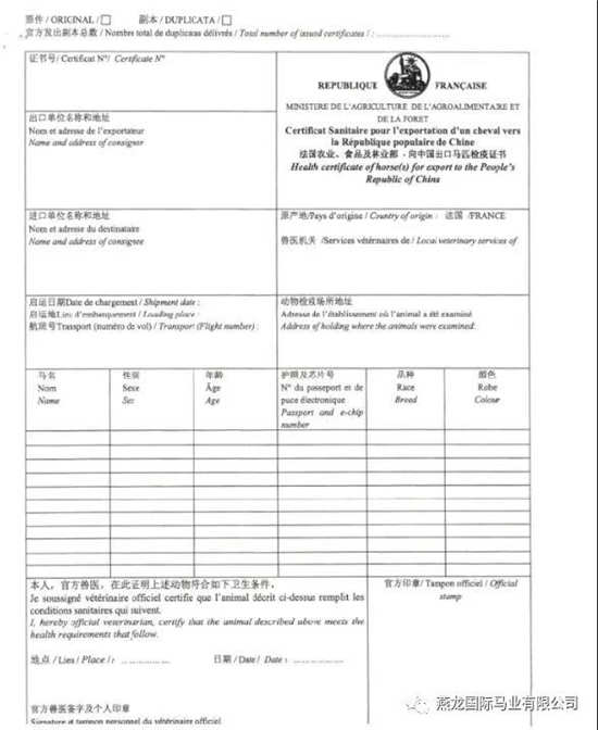 法国进口中国马匹卫生证书