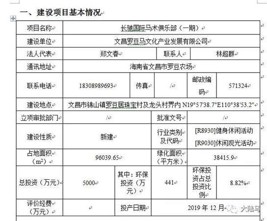 按照《环评公示》介绍,本次长驰拟建设的长驰国际马术俱乐部项目占地面积为96039.65平方米,总投资5000万元。项目的地理位置优良,位于文昌市锦山镇罗豆居珠宝村及龙头村界内,距海口市仅50余公里,距海口美兰国际机场仅20余公里,与海南北部口岸铺前港隔河相望。