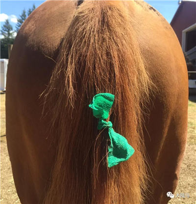 绿丝带意味着这匹马儿没有经验并且可能做出一些意想不到事情。一般绿色带会绑在一些年轻的马匹或性格特别怪异的马匹身上。如果你看到一匹尾巴上有绿丝带的马,一定要小心接近他,注意留给他一定的空间,因为你不能确定哪个细小的动作可能就会让他突然做出奇怪的举动。