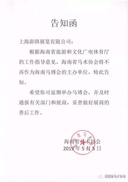 大陆赛马网讯 原定于5月25日举办的2019中国(海南)国际马文化产业博览会被承办方上海澎湃国际展览有限公司在临时更改场地后,又宣布停办,而绝大多数展商和参展观众事先并不知情。