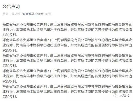 海南省马术协会在5月25日晚上22:33通过微信公众号刊发了一篇名为《公告声明》的文章,内容是不断重复了五段话,并附上了日期分别为5月5日、5月20日和5月25日的三份盖章文件,部分如下——