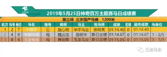 5月25日,2019玉龙国际赛马公开赛第三个比赛日——“神奇百万主题赛马日”在山西右玉的玉龙国际赛马场激情上演。当天共计5场比赛,总奖金达33万元。在第三场“三岁国产马赛”的比赛中,华宇马业旗下赛驹“中国梦”(父系:“苏萨”)以0.27秒的优势夺冠,赛前大热门——8战8捷的“汇通天下”退赛,开闸后“玉龙宝辰”率先抢占有利位置后开始领跑。身后5匹赛驹两个马位劣势跟跑,最后一个弯道,“玉龙宝辰”依旧保持领先地位,弯道转直道后,众赛驹抹平劣势展开冲刺,“腾辉战将”凭借内栏优势一度占据领先位置,随后开始堕退,赛驹“中国梦”在最后200米时完成逆袭并与“华腾优雅”展开决斗,最终“中国梦”以半个马位的优势摘得头名。