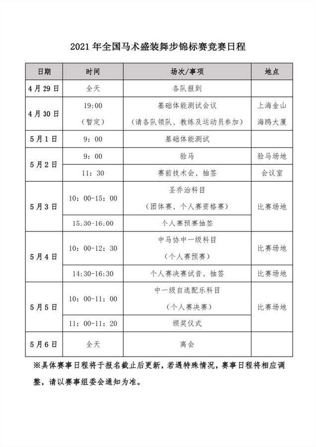 青马网讯 2021年全国马术盛装舞步锦标赛将于2021年5月3日(周一)至5日(周三)在上海市金山区城市沙滩举办。