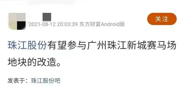 值得注意的是,对马场动心的,除了这一家国企外,还有珠江实业。在 8 月 12 日,东方财富股吧传出 " 珠江股份有望参与广州珠江新城赛马场地块的改造 " 的消息,而这个 " 珠江股份 ",就是珠江实业的证券简称。