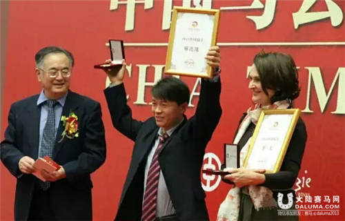 图:中国马会会长贾幼陵(左一)为2015“中国马会骑士勋章”获得者麻连凯(中)、华天(右一,其母罗山代领)