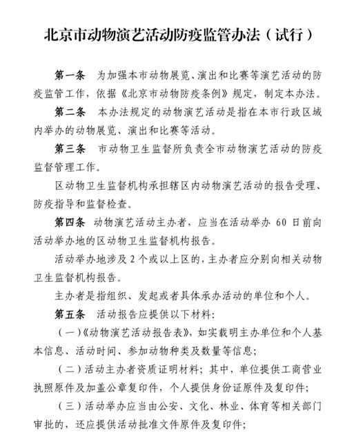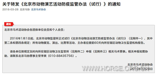 3月28日,北京马术运动协会及时地在其官方微信号发出“关于转发《北京市动物演艺活动防疫监管办法(试行)》的通知”,通知中转载了“卫监所”的文件的内容:“ ...所有动物展览、演出、比赛等活动,主办者应提前60天向所在辖区动物卫生监督机构报告...”