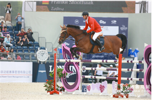 而在另外一个难度更高,更为备受关注的浪琴表大奖赛(1.40m-1.50m)中,德国名将弗兰克-斯洛塔克和他的马匹Newtime De Baussy力压群雄,凭借0失误的完美表现,夺得本项赛事的冠军。来自中国香港的郑文杰遗憾获得第二名,杰瑞-斯密特获得第三。