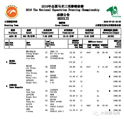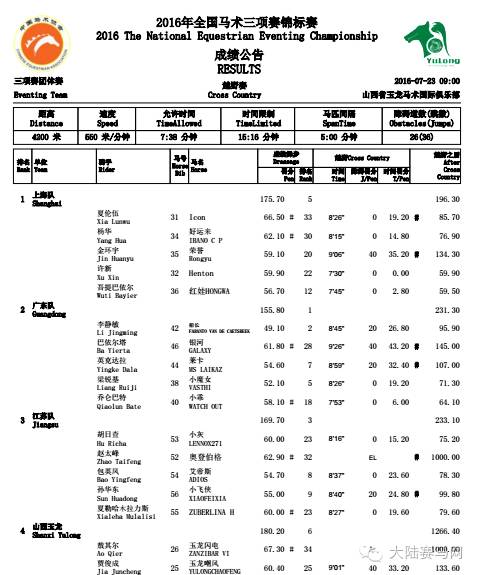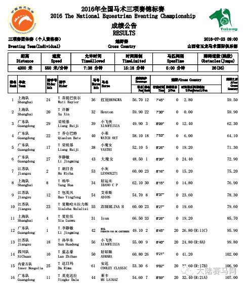 上海队骑手许新策骑“Henton”以0罚分获得越野赛冠军!同样是来自上海队的骑手吾提巴依尔策骑“红娃”获得亚军(障碍罚分0分,时间罚分2.8分);广东队的骑手乔仑巴特策骑“小乖”获得季军(障碍罚分0分,时间罚分6分)。