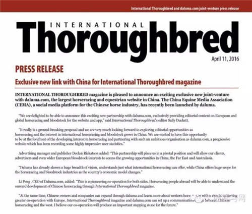 4月11日,总部位于英国的欧洲《国际纯血马》杂志正式宣布与大陆赛马网达成独家战略合作伙伴协议。