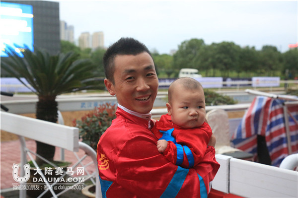 在当天的“荷斯威尔杯”三岁短途精英赛中,河北东兴马主杨洪强旗下的赛驹“独具慧眼”在王迪策骑下霸气夺冠,在赛后的拉头马环节和颁奖台上,我们都看到一个身穿河北东兴彩衣的小宝贝儿,他正是本场冠军练马师、河北东兴著名骑师张明亮的不满一岁的儿子。小宝贝儿顿时成为全场焦点,吸引了全场的目光,这对冠军父子也给武汉赛马节增添了浓浓的暖意。
