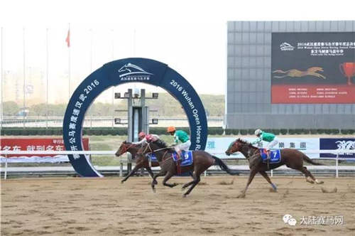 在昨日武汉当地举办的2016年速度赛马公开赛年度总决赛中,已经解禁的“亿通神驹”(前)参赛,并夺得冠军。图/大陆赛马网