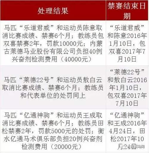 眼下,中国赛马界存在着中国马术协会和中国马业协会两个协会机构,客观上也造成了监管困难。在日前的这份中国反兴奋剂的处罚报告中显示,衡水亿通的教练员田松被禁赛两年,罚款5000元,禁赛结束日期是2017年10月24日。