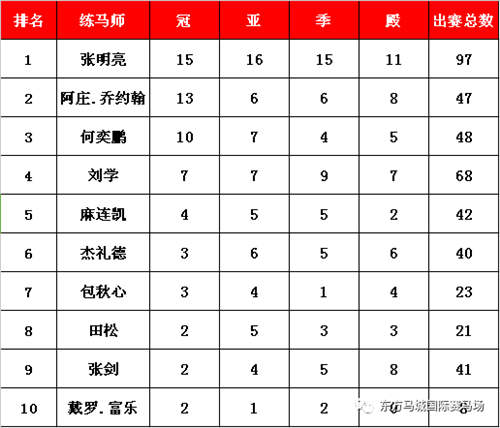 练马师方面,本赛季,练马师张明亮凭借其马房“东兴精神”、“踏雪”、“中国红”、“独具慧眼”、“东兴小虎”、“扳手”、等一众马匹在不同场次的胜出,收获15场头马,将成为本年度冠军练马师不二人选。