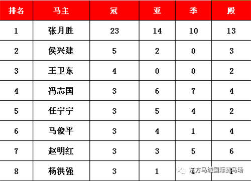 马主张月胜先生,凭借其名下马匹的优异表现,以23场头马的强劲实力高居马主排名榜首位;侯兴建先生则以5冠2亚位列第二;马主王卫东先生以4场头马冠军位列第三;冯志国先生以3个头马位列第四。