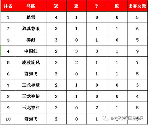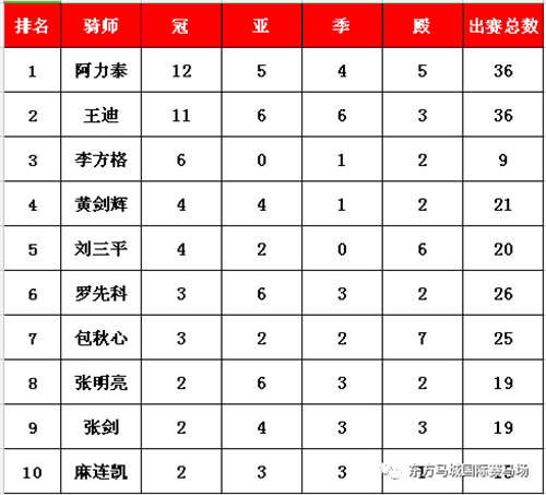 再表骑师方面,一个赛季的比拼,老将阿力泰凭借策骑“玉龙神驰”、“玉龙神鹰”、“玉龙神童”等赛驹的骄人战绩,以12冠暂列榜首;小将王迪则以策骑“东兴精神”、“独具慧眼”、“中国红”、“扳手”、“东兴小虎”等马匹的出色表现,交出11冠场头马紧随其后,最后决战有多种战果出现,如若阿力泰与王迪战成平手,则必须计算其冠、亚、季、殿累积积分,从两位好手末战分场分析,不战至最后恐难分高下,在年度总决赛上,阿力泰与王迪将有一番龙虎之斗。