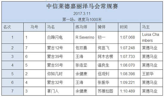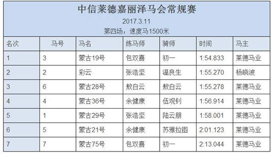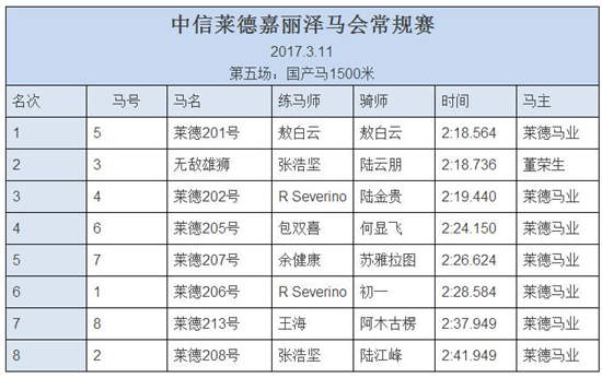 3.11昆明中信莱德嘉丽泽马会速度赛五场比赛完全赛果