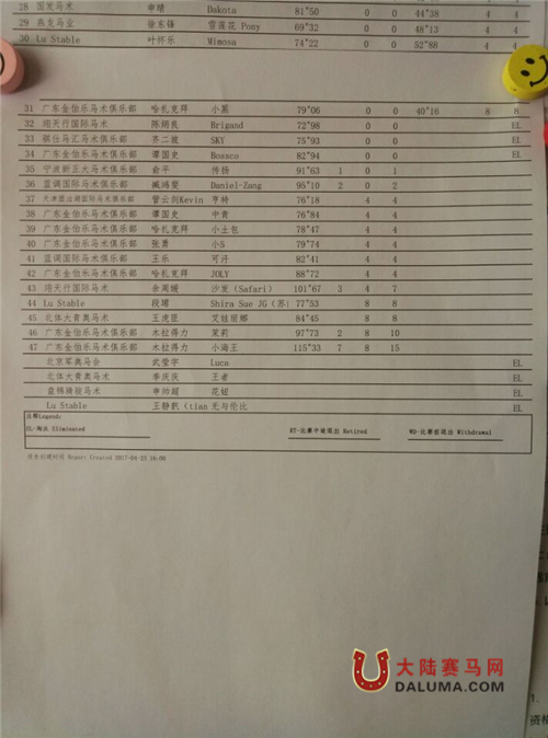 4月23日,2017“鸟巢之路”冠军杯马术巡回赛第一站在多美马术国际中心举行。最终广东金伯乐马术俱乐部的选手木拉得力策骑“小奶牛”以34秒77的成绩成功捧得本场80CM级别场地障碍赛的冠军奖杯。 本场比赛的亚军由蓝调国际马术俱乐部的马志远策骑“天辉”以35秒22的成绩摘得。同一单位的邹昊霖策骑“春雨”尽以相差0.65秒的成绩获得季军。