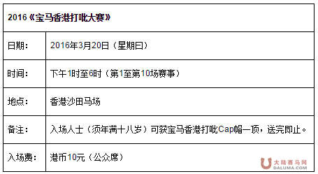 香港2016年3月9日,《宝马香港打吡大赛》连续第四年由著名汽车品牌宝马香港冠名赞助,今年将于3月20日在香港沙田马场隆重上演,此项只限四岁马匹参与的赛事,由14匹精英赛驹在草地跑道竞逐途程2000米、奖金1800万港元,被誉为“四岁功名.一生一次”的冠军殊荣。