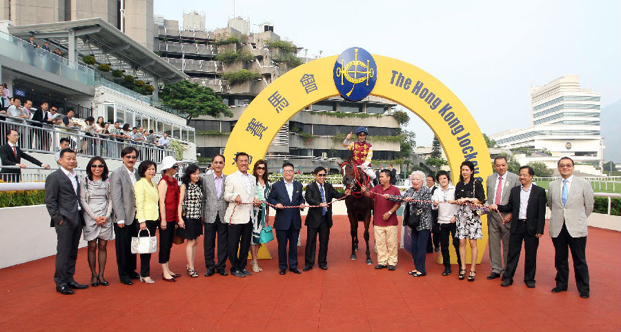 “跑宝贝跑”的马主代表及亲友与练马师叶楚航在凯旋门庆祝胜利