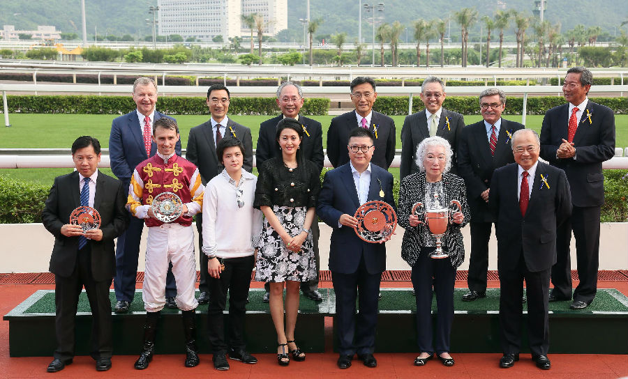 马主代表、练马师叶楚航及骑师安国伦在沙田短途锦标颁奖仪式上合影