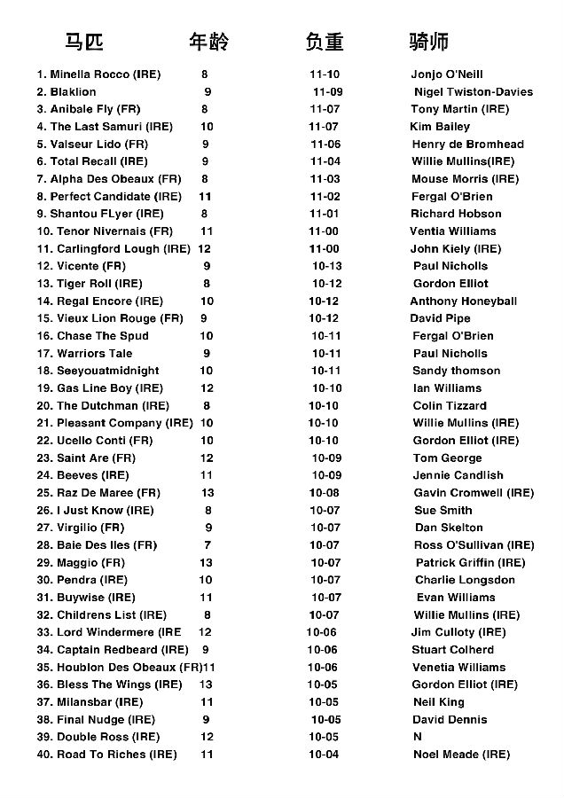 英国当地时间星期六4月12日,40匹赛马已确定将参加2018年英国国家障碍赛。其中Minella Rocco依旧是负重重量最高的马匹。