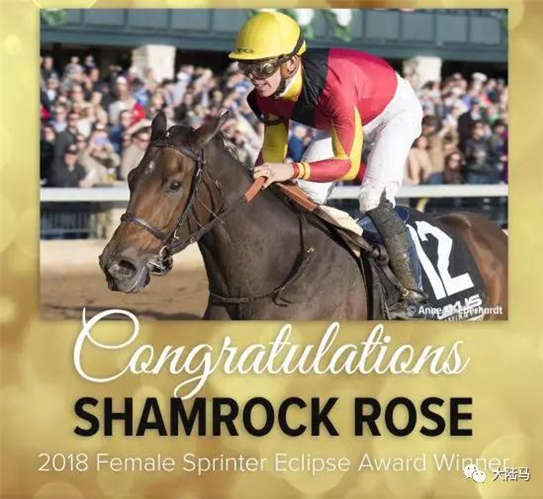 美国时间1月24日,被誉为“赛马奥斯卡”的美国赛马最高奖项日蚀奖在美国佛罗里达州的湾流公园赛马场(Gulfstream Park)正式举行,“日蚀奖”代表着美国赛马最高荣誉,该奖项是为了纪念18世纪一匹名叫“日蚀”(Eclipse)的马匹而设立,表彰赛马运动中出色的赛驹,以及对该运动做出杰出贡献的人们。每年年底,评委会根据当年的表现为每个奖项选出入围马匹或入围人选,再从他们中选出最终的奖项获得者,在下一年的一月公布。这些奖项中包括“最佳两岁雄马”(2-year-old male)、“最佳三岁雄马”(3-year-old male)、“杰出马主”(Owner)、“杰出骑师”(Jockey)等;而最为重要的莫过于“年度马王”(Horse of the Year)奖项,因为其地位的重要性,理所当然的被称为了“赛马奥斯卡”。其中,Shamrock Rose当选“最佳短途雌马”。