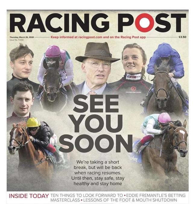 受新冠肺炎疫情影响,创刊34年的英国《赛马邮报》(Racing Post)由于英爱等国先后暂停赛事,在今日头版宣布暂停纸质版印刷,一切等赛马回归。英国《赛马邮报》(Racing Post)是英国最权威的赛马报纸,被誉为“英国赛马圣经”。