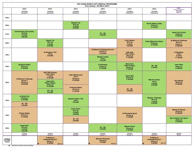 大陆赛马网讯 迪拜世界杯嘉年华公布2021年赛程,因新冠疫情影响,奖金会进行缩水。由1月21日至2月25日举行六周迪拜世界杯嘉年华赛事,1月21日七场编排赛事,六场为表列赛及分级赛,3月6日为超级星期六。所有赛事的奖金将缩减约25%,取消的赛事就有阿联酋一千坚尼预赛及阿联酋二千坚尼预赛。