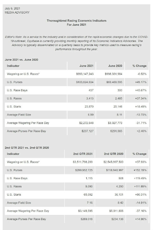 7月6日,美国权威赛马数据公司Equibase公布了2021年美国赛马6月的相关数据。其中,6月的投注额为9亿9314万7243美元,同比下降0.52%,但这一数字比2019年同期上涨了0.22%。