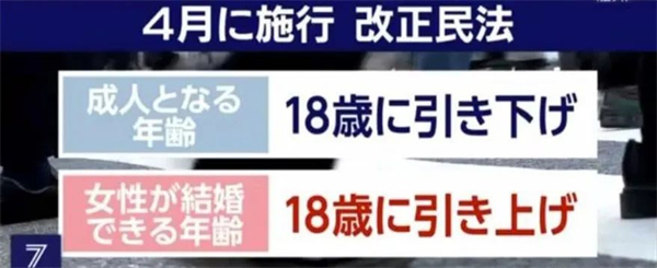 根据日本新通过的民法修正案,今年4月份日本将“成年人”的年龄从20岁下调到了18岁。这也是日本时隔140年以来,首次下调“成年人”的法定年龄。除了将法定年龄下调,同时还将女性允许结婚的年龄上调到了18岁。民法修改前为16岁允许结婚。