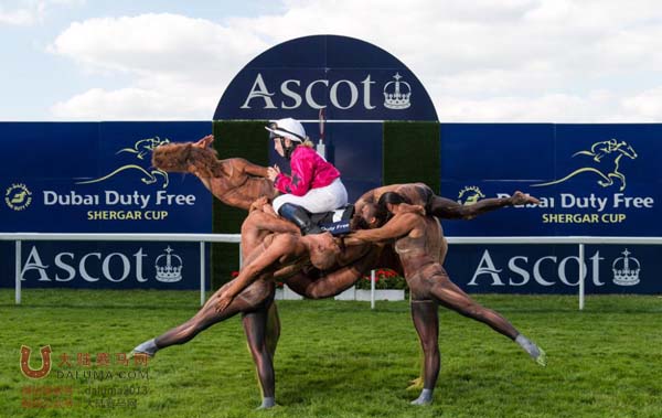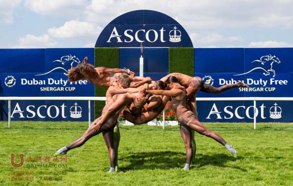 近日,英国阿斯科特赛马场,10名杂技演员组成赛马的形状,庆祝即将举行迪拜免税店杯赛马日到来。这一比赛是应该唯一一个团队形式参加的比赛日,将在8月9日举行。