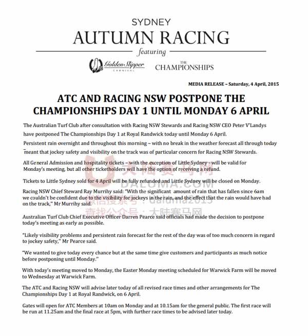 据澳大利亚赛马会4月4日早间公告,因悉尼昨夜一直延续到今天白天的大雨,为了保障骑师、马匹的安全,维护赛道,原定于4月4日举行的澳大利打吡赛马日赛事推迟至4月6日举行。首次代表中国马主出战的“蒙古可汗”将推迟亮相。