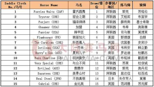 海外赛事第一组 第四场  晚上11:45     15匹参赛马