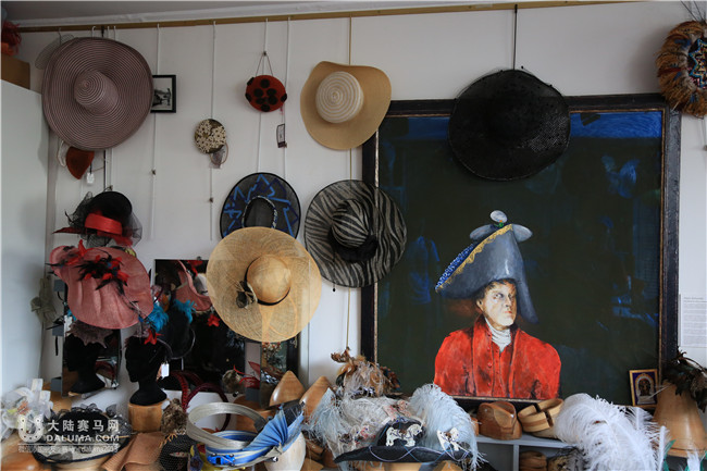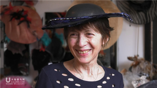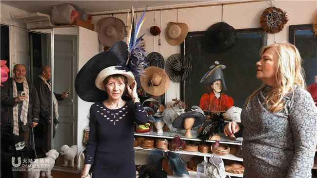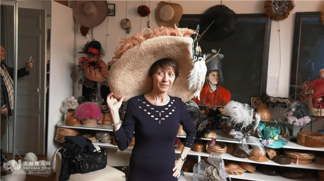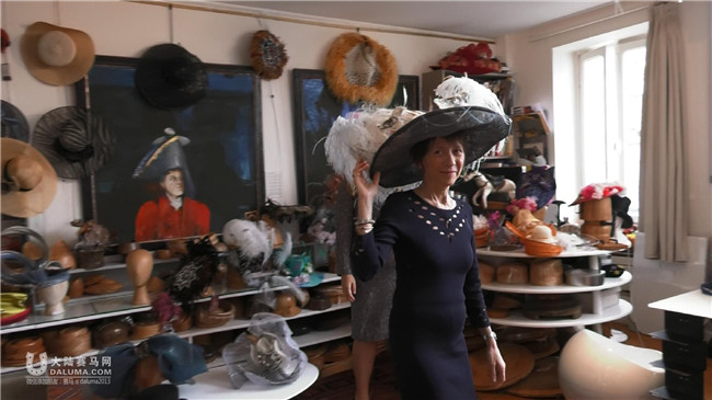 索菲说这件帽子融入了很多古罗马的传说。古罗马时期很多预言未来的人都会戴两根羽毛的帽子,这位女士的帽子有一根羽毛,每顶帽子都有一个故事。