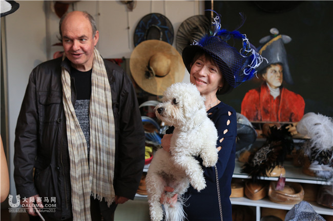 恰逢索菲的老客户——一位绝对法国的优雅女士和她的丈夫,还有他们的狗,一起来取周日出席戴安娜大奖赛的帽子。这样的画面是不是在法国电影里频繁看到?