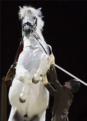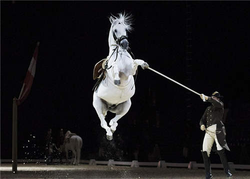 这项表演被形象地称作“山羊跳”,从空中轻松滑行而过的白马仿佛是天马派格萨斯再世,只是少了一对翅膀,若不是被缰绳束缚,大有要飞出舞台的架势。彩排中还有一项高难度的表演,需要骏马后肢着地,前肢扬起,保持平衡。这些神奇的表演尽显利比扎马的优雅与运动美感。