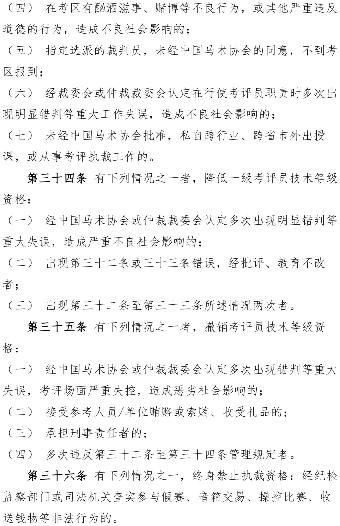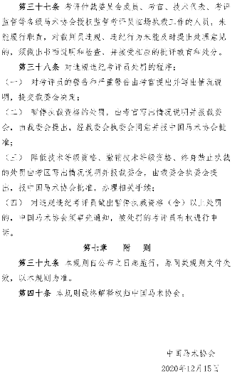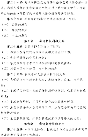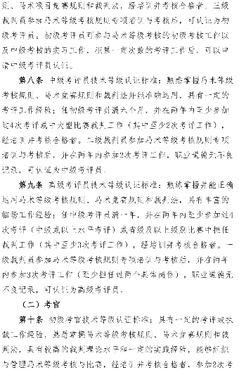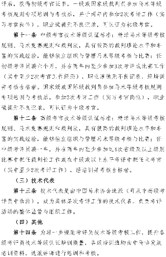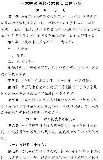 青马网讯 近日,为规范马术等级考核活动,中国马术协会制定了《马术等级考核技术官员管理办法》,并在官方网站完成了7个工作日的公示,公示期内未收到原则性的修改意见。现下发该办法,请相关单位及个人仔细研读,遵照执行。