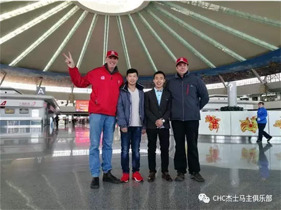 两位骑师在出发前在内蒙古鄂尔多斯国际机场与CHC练马师合影
