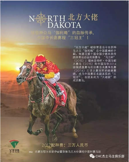 “北方大佬”(North Dakota)出生于2010年5月14日,是一匹枣色公马。作为多次获得世界第一种公马称号的“伽利略”(Galileo)的嫡子,欧洲顶级种公马“鞍匠井”(Sadler’s Wells)的嫡孙,他的血统自然也是顶级。他的半血兄弟中已经有10匹成为种公马,并且成功孕育出了G1一级赛冠军。