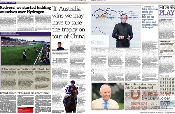 “如果“澳大利亚”幸运获胜,我们将高举奖杯巡游中国!很快我们将展开中国大陆十个城市的慈善和教育之旅。与中国时尚芭莎通力合作,我们将在马年向国人宣传速度赛马运动并为慈善事业募集资金。”