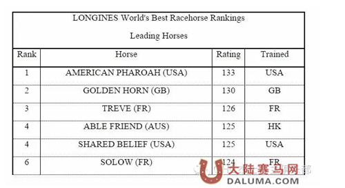 国际赛马机构联盟(IFHA)于11月8日公布了2015年度最终的浪琴表世界赛马排名。美国三冠王赛马“美国法老”(American Pharoah)当仁不让以133分位居榜首,成为年度赛马王,欧洲王者“金号角”(Golden Horn)以3分之差名列第二。由卡塔尔赛马公司所拥有的法国名马“卓芙”(Treve)紧随其后排第三。