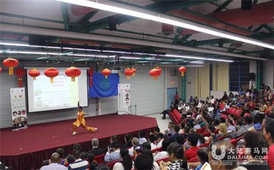 晚会开场时,首先播放了讲述中国、孔院和巴国之间友谊关系的视频,视 频还特别加插了作为友谊使者的我们的照片。当晚的主持人是两位约八、九岁的当地华人小美女与小帅哥,他们穿上绣有龙凤呈祥图案的中国红服饰,站在台上以流利标准的中英文以及生动有趣的口条主持着节目。当晚节目内容丰富多彩,包括了歌、舞、戏、曲、武,将博大精深的中国文化展现得淋漓尽致。此外,当晚还穿插了互动抽奖环节,陈黎有幸成为幸运儿,获得了一本非常经典的中国京剧书。