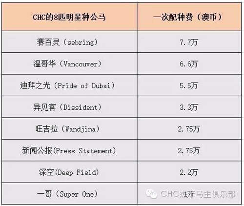 CHC杰士马主俱乐部这8匹种公马的一次配种费累计31.8万澳币,按照最新的汇率,约合160万人民币