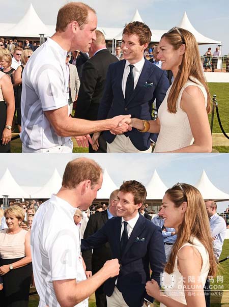 “小雀斑”夫妇助阵剑桥慈善马球赛,跟埃迪·雷德蒙恩的伊顿同窗威廉王子叙上了旧。埃迪·雷德梅恩给老同学威廉王子介绍自己的妻子汉娜。